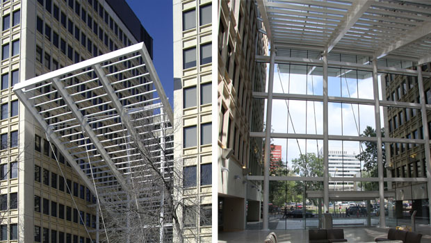 If buildings were contestants on TV make-over programs, the transformation of the Capital Health Centre entrance in downtown Edmonton from mousy to elegant would steal the show. When Capital Health purchased the 1970s office complex for use as its headquarters, the two concrete towers were connected by a dark, uninviting, one-storey entry.